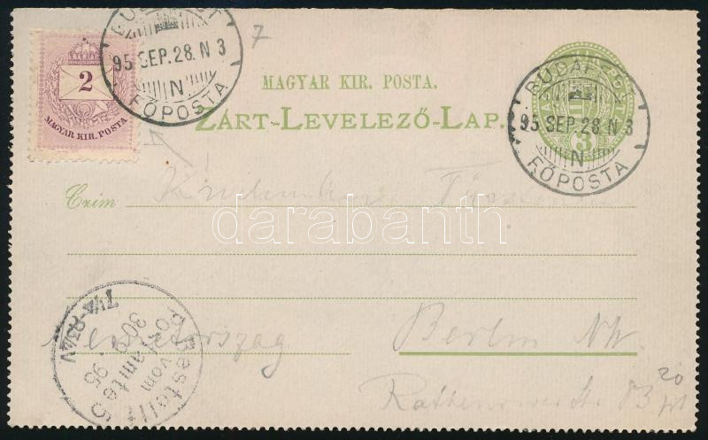 1895 3kr díjjegyes zárt levelezőlap 2kr díjkiegészítéssel, hátoldalon millenniumi levélzáróval, Berlinbe / PS-cover card with additional franking to Berlin, with label (Image)(Image 1)