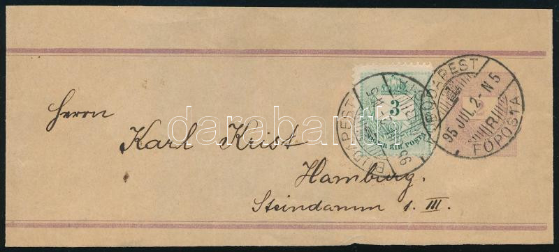 1895 2kr díjjegyes címszalag darab 3kr kiegészítéssel Hamburgba / 2kr PS-wrapper piece with 3kr, to Hamburg (Image)(Image 1)