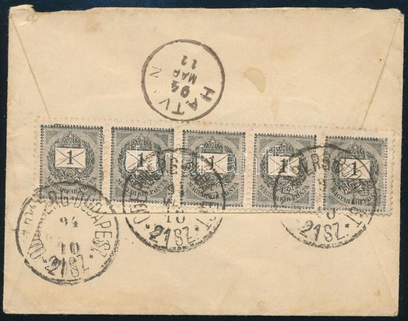 1894 Levél 1kr ötöscsíkkal bérmentesítve, "ODERBERG-BUDAPEST / 21 SZ." mozgóposta bélyegzéssel Hatvanba/ Cover with stripe of 5, "ODERBERG-BUDAPEST / 21 SZ."