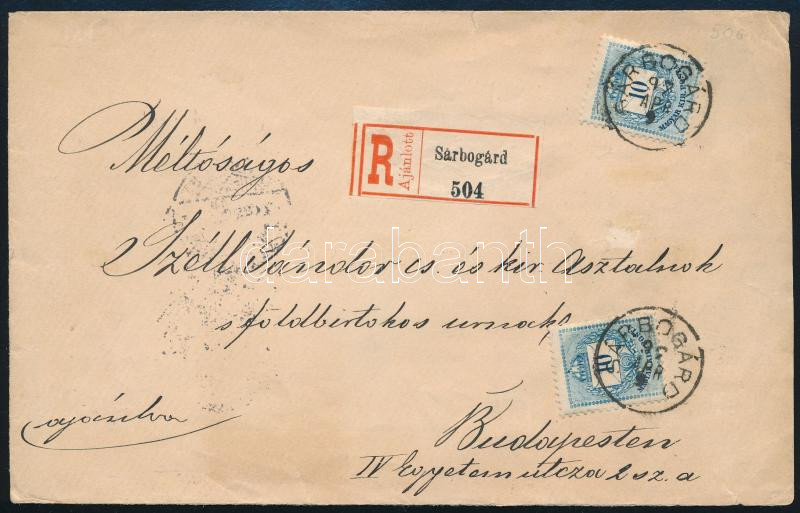 1897 2. súlyfokozatú levél 2 x 10kr bérmentesítéssel, "SÁRBOGÁRD" - "BUDAPEST / FŐPOSTA" / 2nd weight class cover with 2 x 10kr franking, "SÁRBOGÁRD" - "BUDAPEST / FŐPOSTA" (Image)(Image 1)