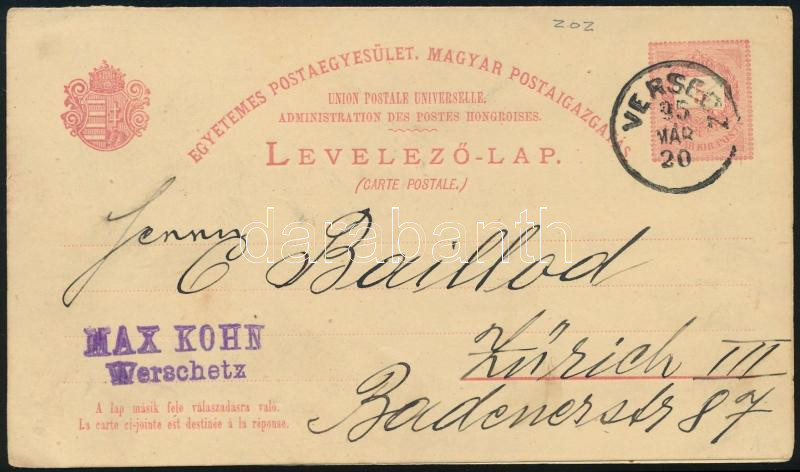 1895 5kr válaszos levelezőlap "VERSETZ" / PS-reply card to Zürich (Image)(Image 1)