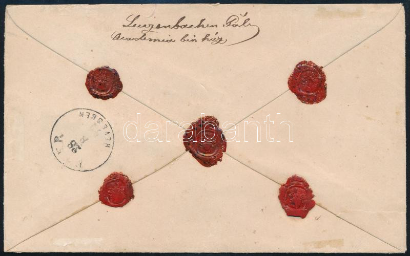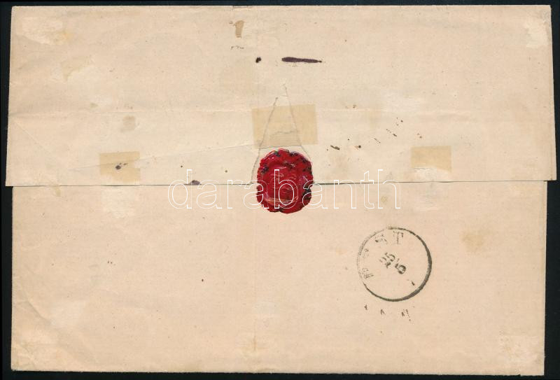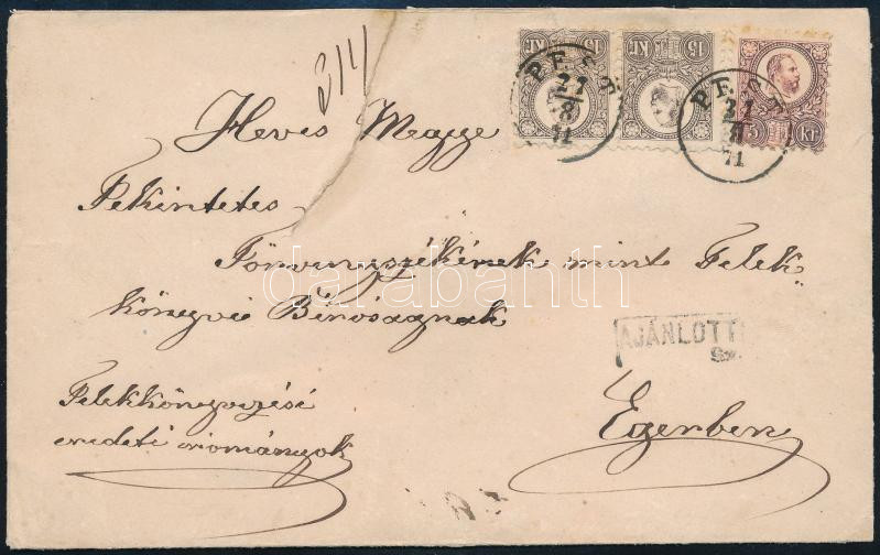 5. súlyfokozatú ajánlott levél Réznyomat 5kr + 2 x 15kr bérmentesítéssel, "PEST - EGER / HEVESBEN", nagyon ritka bérmentesítés, RRR! / 5. weight class registered cover with 5kr + 2 x 15kr. RRR! (Image)(Image 1)