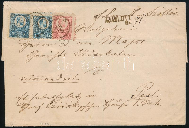 1872 Réznyomat 5kr + 2 x 10kr 3. súlyfokozatú ajánlott levélen / Mi 10 + 2 x 11 on 3rd weight class registered cover "PÁSZTÓ" - Pest (Image)(Image 1)