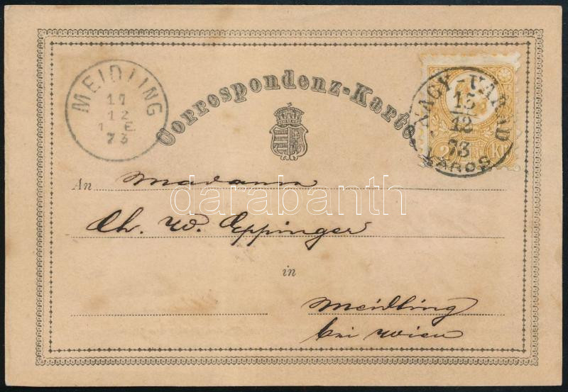1869-es 2kr díjjegyes levelezőlapon Réznyomat 2kr bérmentesítés (felülragasztva) / Mi 8 on 1869 2kr PS-card (glued on top) "NAGY-VÁRAD / VÁROS" - Meidling