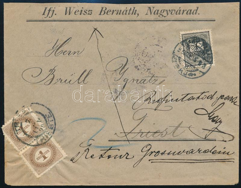 1899 Nagyváradról küldött nyomtatvány 1kr bélyeggel Triesztve, ott megportózták 2 x 1kr osztrák portóval, a címzett a portót nem fogadta el, ezért visszaküldték Nagyváradra / Printed matter with 1kr from "NAGY-VÁRAD" to Triest, with 2 x