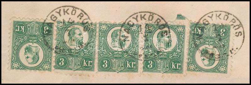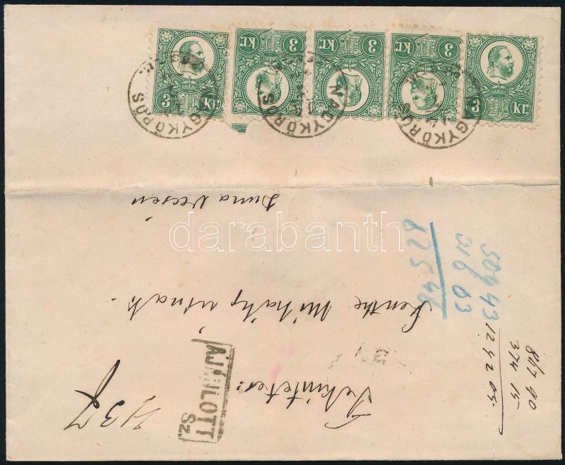 Réznyomat 5 x 3kr ajánlott levélen / 5 x Mi 9 on registered cover "NAGYKÖRÖS / PEST.M." - "DUNA VECSE" (a bélyegeket nem érintő vízszintes hajtás / folded cover)