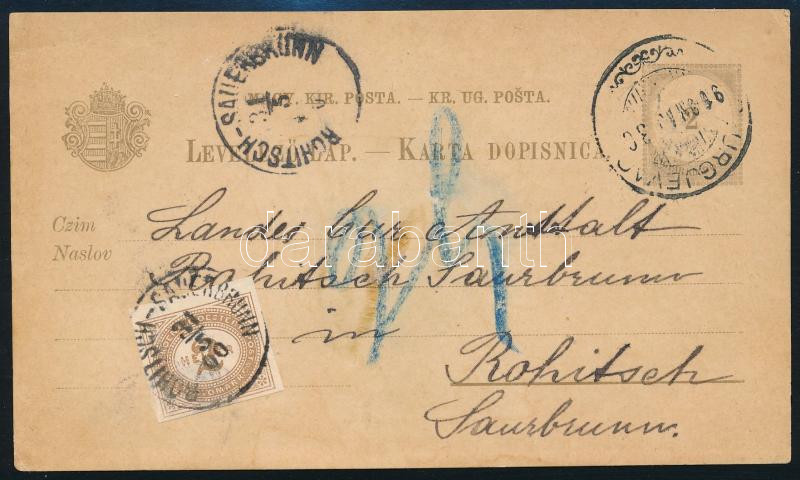 1900 2kr díjjegyes levelezőlap 2kr osztrák portóval / PS-card with 2kr Austrian postage due, "DJURGJEVAC" (Image)(Image 1)