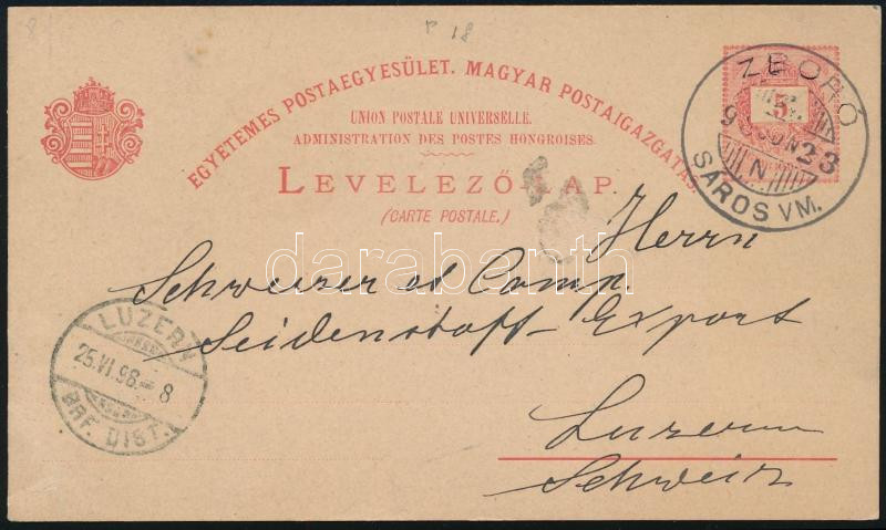 1898 5kr díjjegyes levelezőlap / PS-card "ZBORÓ / SÁROS VM." - Luzern (Image)(Image 1)