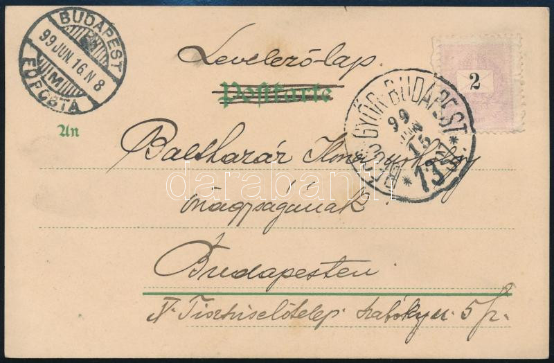 1899 Képeslap "BÉCS-GYŐR-BUDAPEST" vasúti mozgóposta bélyegzéssel / Postcard with railway postmark (Image)(Image 1)