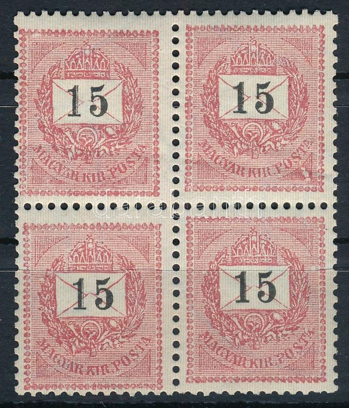 15kr négyestömb luxus minőségben, a jobb felső bélyeg alsó háromszögénél nagy kitörés / plate flaw (Image)(Image 1)