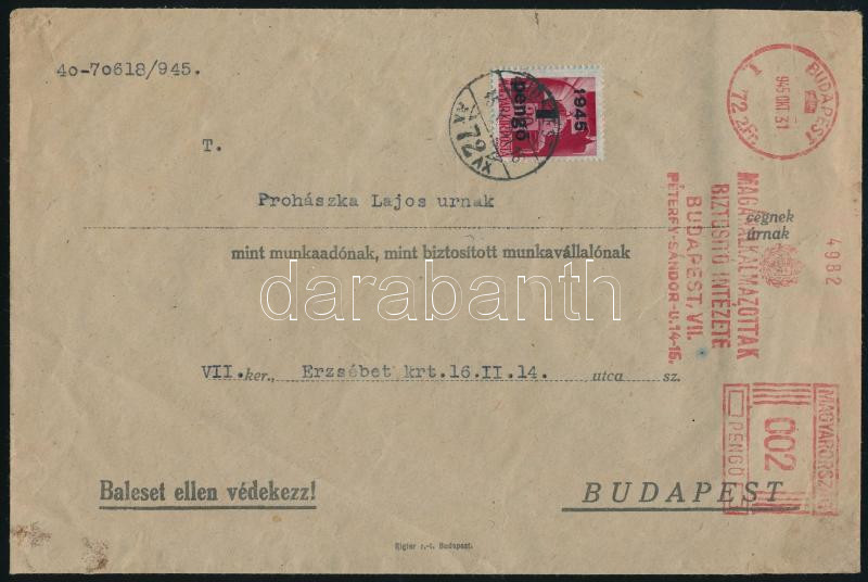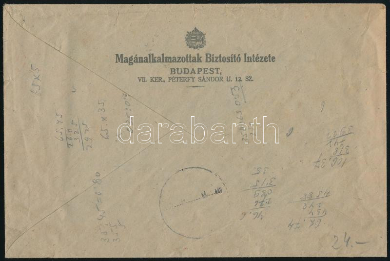 (3. díjszabás) Budapest helyi levél vegyes bérmentesítéssel: 4P bélyeg és 2P gépi, "MAGÁNALKALMAZOTTAK BIZTOSÍTÓ INTÉZETE" bélyegzéssel / Local cover with 4P stamp and 2P machine mixed franking (Image)(Image 1)