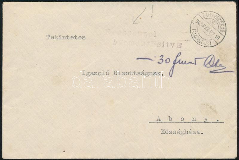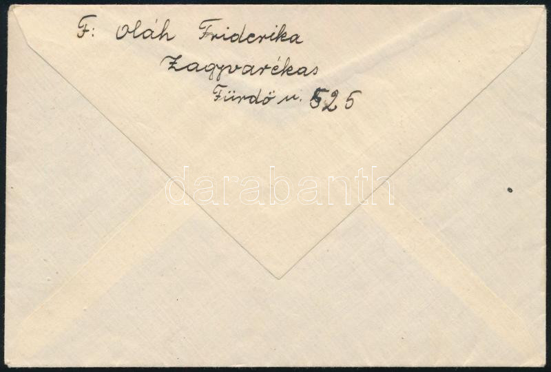 1945.03.27. Távolsági levél készpénzes bérmentesítéssel "ZAGYVARÉKAS" - Abony / Domestic cover with handwritten franking (Image)(Image 1)