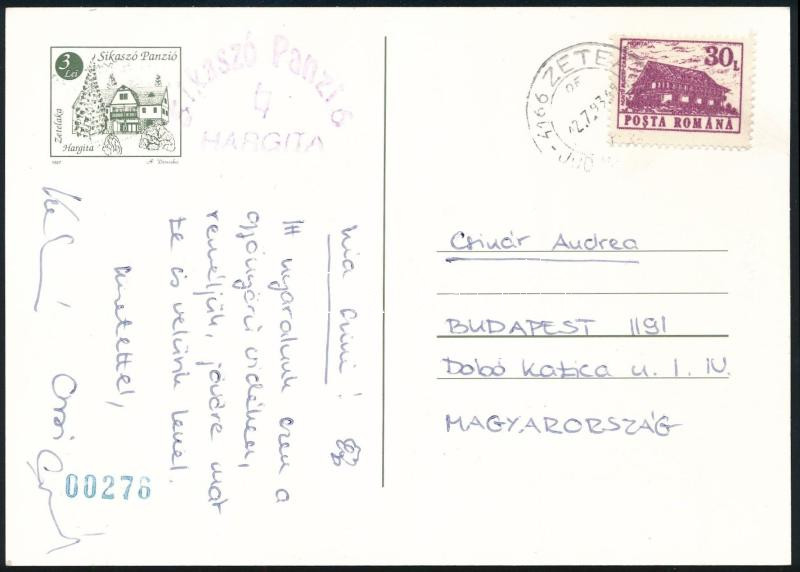 1993 Díjjegyes levelezőlap Sikaszó Panzió bélyegzéssel Budapestre / PS-card with hotelpost postmark to Budapest (Image)(Image 1)
