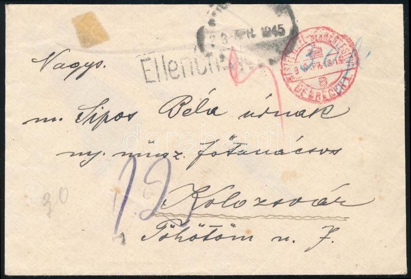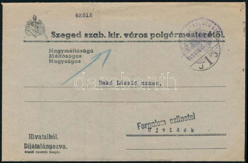1945.febr.14. Tértivevényes levél külföldre, "Forgalom szünetel" visszaküldve / Official cover to Ujvidék, redirected (Image)(Image 1)