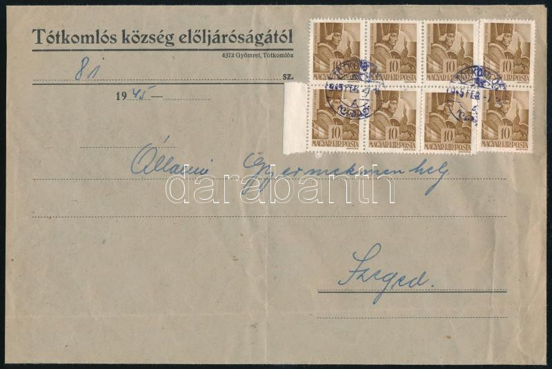 1945.febr.7. Távolsági levél 8 db bélyeggel, 30f helyett 80f bérmentesítéssel, kék "TÓTKOMLÓS" - Szeged / Domestic cover with 80f franking instead of 30f, blue "TÓTKOMLÓS" cancellation (Image)(Image 1)