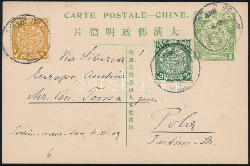 1909 Díjkiegészített díjjegyes levelezőlap egy osztrák-magyar tengerésztiszttől Polára, "TSCHIN-WAN-TAO" / PS-card with additional franking sent from an Austro-Hungarian navy officer in "TSCHIN-WAN-TAO" to Pola (Image)(Image 1)