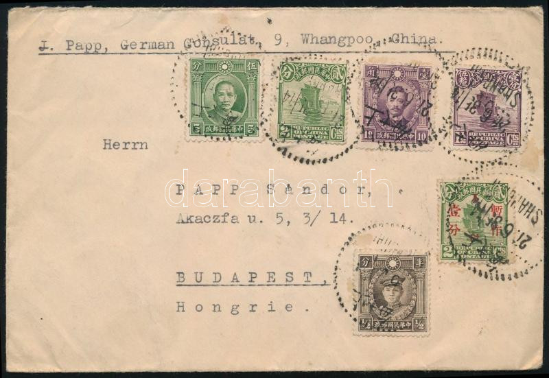 1935 Ajánlott levél dekoratív bérmentesítéssel, a német konzulátusról küldve, "SHANGHAI" - Budapest / Registered cover from the German consulate to Budapest, "SHANGHAI" (Image)(Image 1)