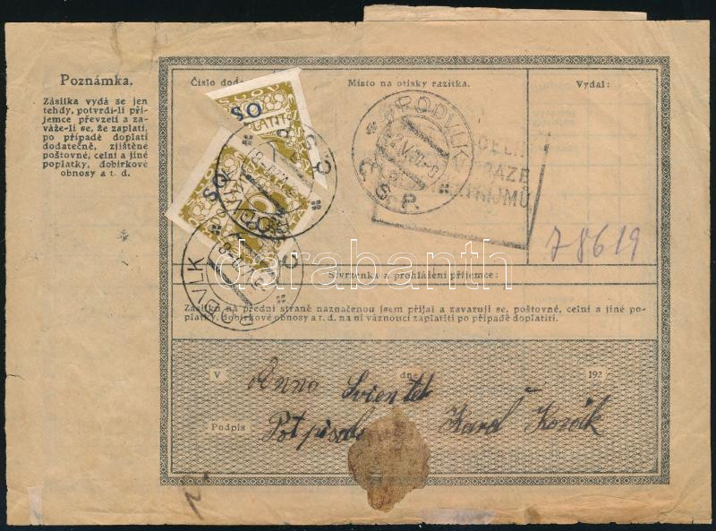 1920 Csomagszállító 50H és felezett 50H portó bélyeggel "PODVLK" / Parcel card with Mi 8 + bisected Mi 8 postage due stamp "PODVLK" (ex Dunafila, ex Cornides)
