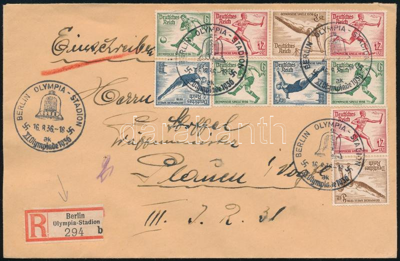 1936 Ajánlott levél 10 db Olimpia bélyeggel, alkalmi ragjeggyel / Registered cover with 10 Olympiad stamps and special label (Image)(Image 1)