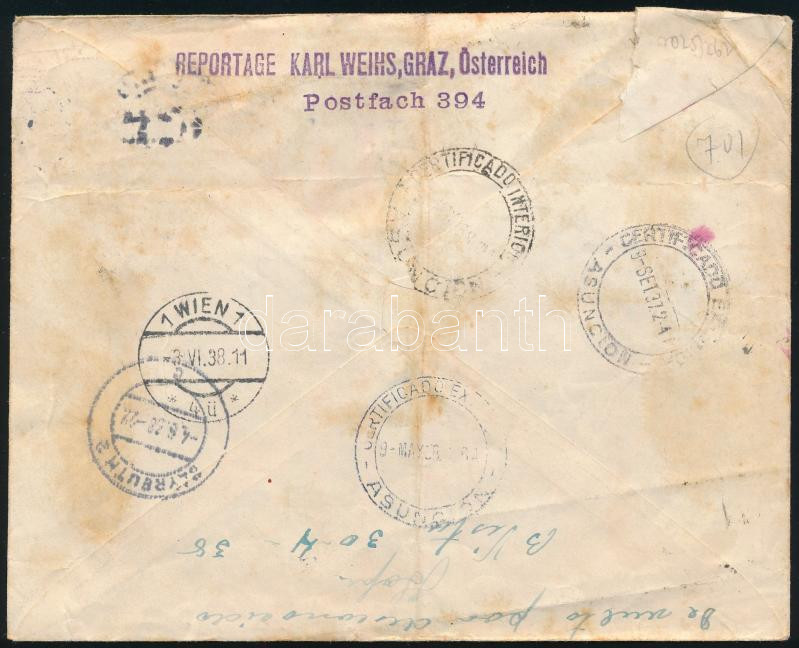 1938 Ajánlott levél Paraguayba, visszaküldve / Registered cover to Paraguay, returned "BAYREUTH" (Image)(Image 1)