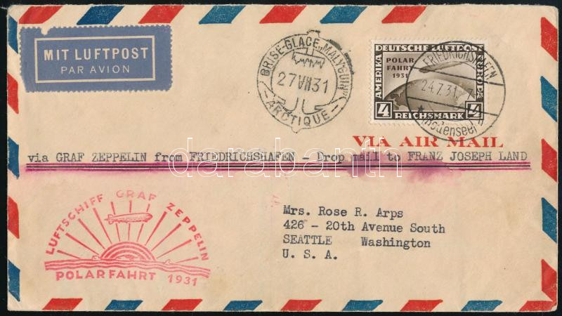 1931 Zeppelin levél Polarafahrt 4RM bélyeggel Seattle-be + Polarfahrt 1RM és 2RM bélyeg / Mi 458 on cover + Mi 456-457 (Mi EUR 1.300.-) (Image)(Image 1)