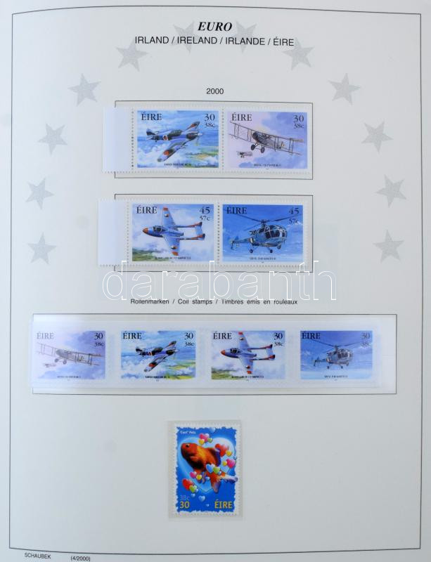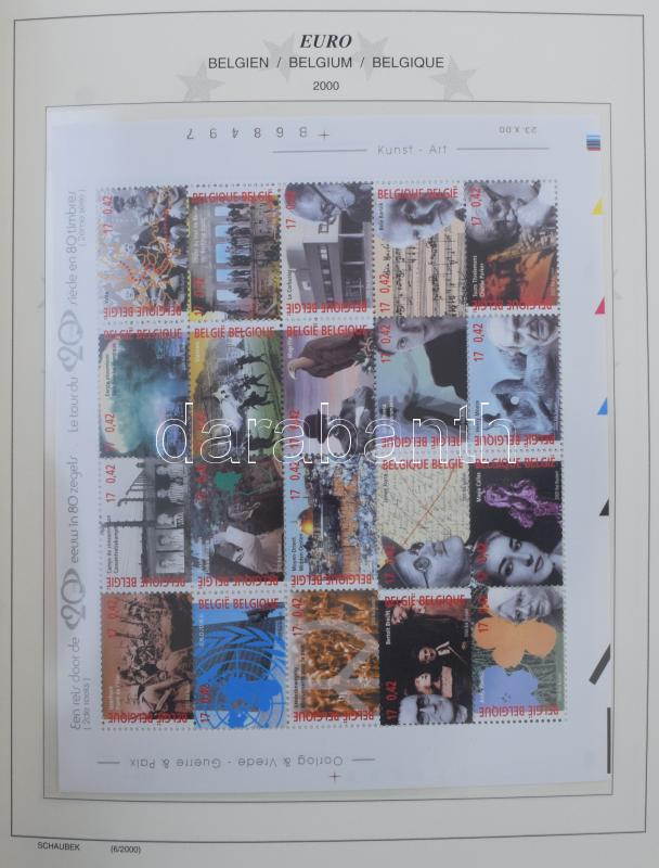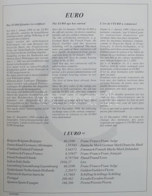 Schaubek falcmentes luxus album az Euro bevezetése 1999-2000, 11 európai országból. Szép postatiszta anyag, kevés hiány a felár nélküli névérték 400 EUR. Szép anyag! (150 lapos album) / Schaubek luxury album Euro introduction 1999-2000,