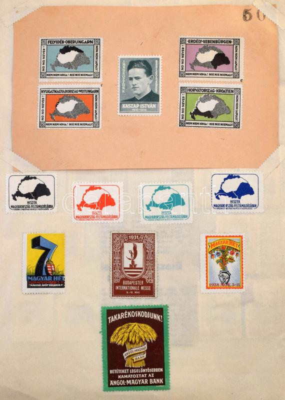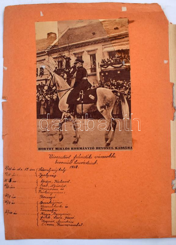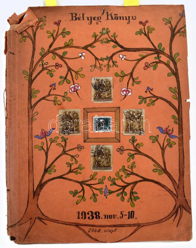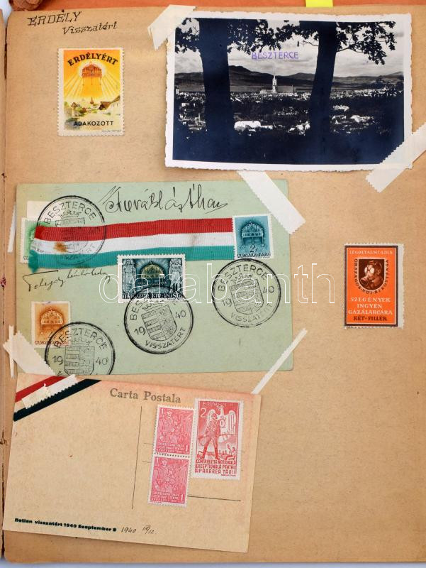 1938-1940 Házi készítésű "Bélyegkönyv" irredenta, hazafias témákkal, Visszatért bélyegzésekkel, levélzárókkal, újságcikkekkel stb. Érdekes anyag, feltétlenül érdemes megnézni! / Homemade "Stamp Book" with VISSZATÉRT postmarks,