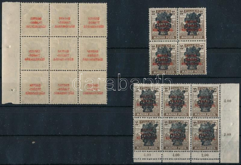 1920 Búzakalász 20f tétel: 9-es tömb gépszínátnyomattal, a másik két összefüggés eltérő színárnyalatú felülnyomással, egyik kettős fogazással / Mi 299 small lot: machine offset, red colour variety, double perforation (Image)(Image 1)