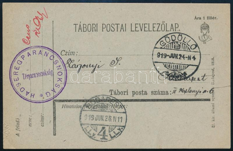 1919 Tábori posta levelezőlap "HADSEREGPARANCSNOKSÁG / Térparancsnokság" + 3 klf egyéb bélyegzéssel, "GÖDÖLLŐ" - BUDAPEST" / Field postcard with 4 different postmarks to Budapest (Image)(Image 1)