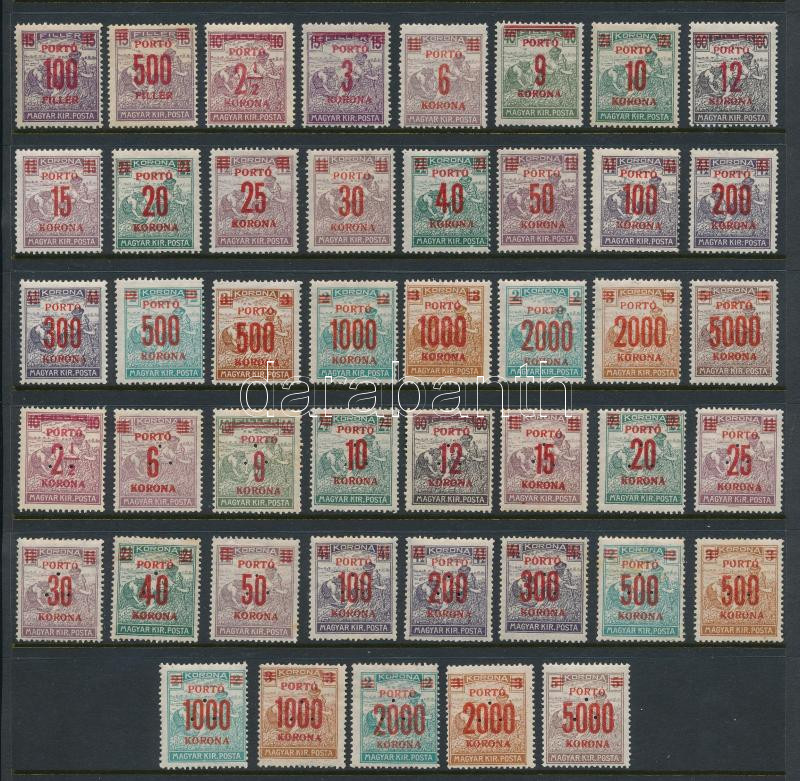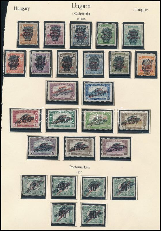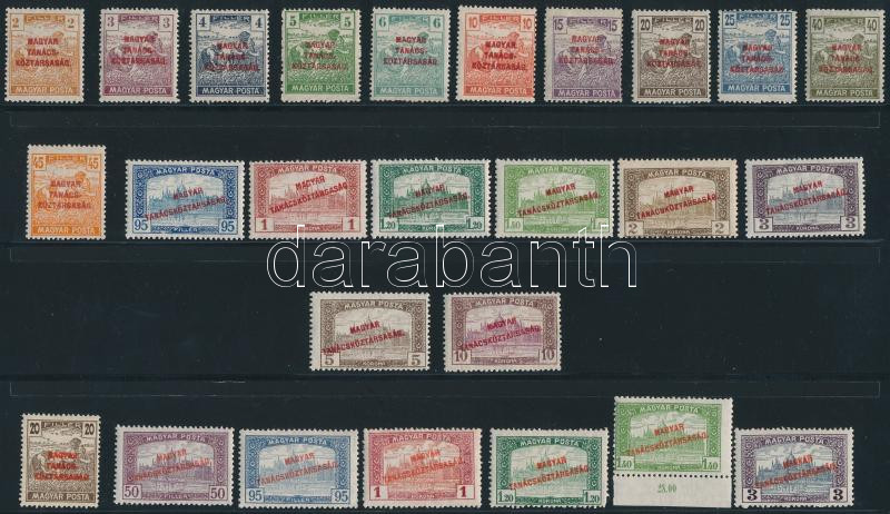 1919 Magyar Tanácsköztársaság sor minden létező értéke kármin felülnyomattal + 7 klf érték téglavörös felülnyomattal (10f helyett 1K) / Mi 266-285 set in all existing overprint varieties (Image)(Image 1)
