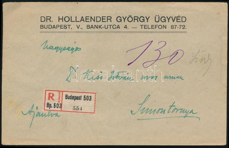 1926 Ajánlott távolsági levél 4.500K bérmentesítéssel, levélzáróval / Registered domestic cover with 4.500K franking and label (Image)(Image 1)
