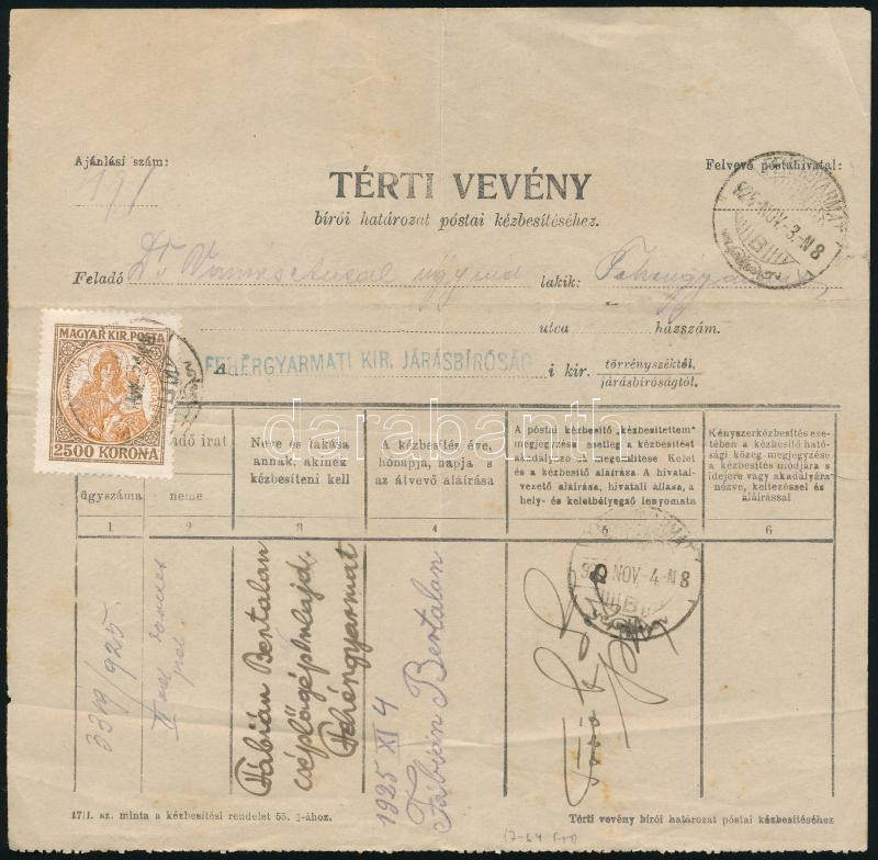 1925 Tértivevény Koronás Madonna 2.500K bérmentesítéssel / Receipt with 2.500K franking "FEHÉRGYARMAT" (Image)(Image 1)