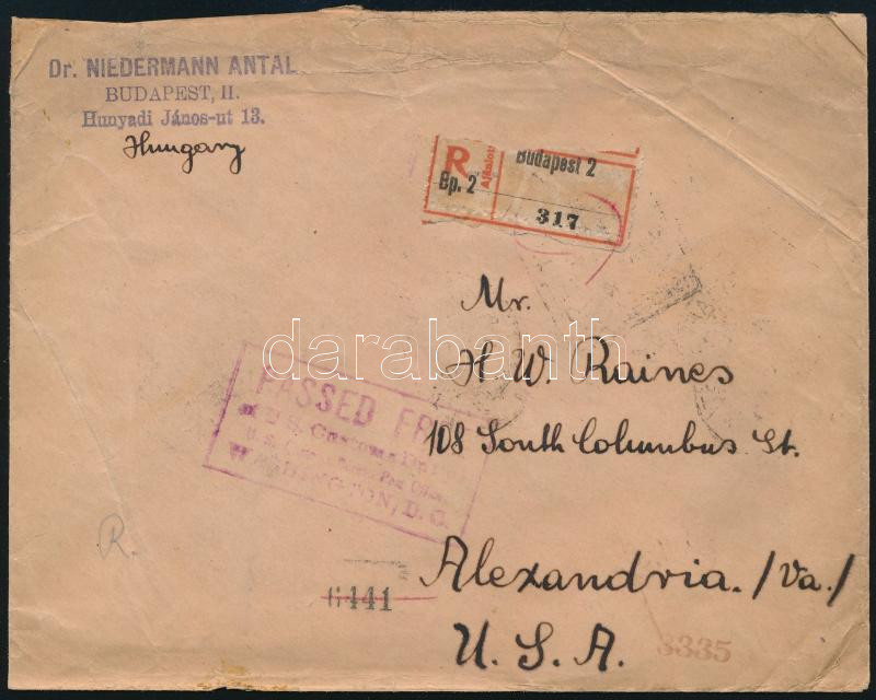 1926 Ajánlott levél 16.000K bérmentesítéssel Alexandriába (USA), "BUDAPEST" / Registered cover with 16.000K franking to the USA (Image)(Image 1)