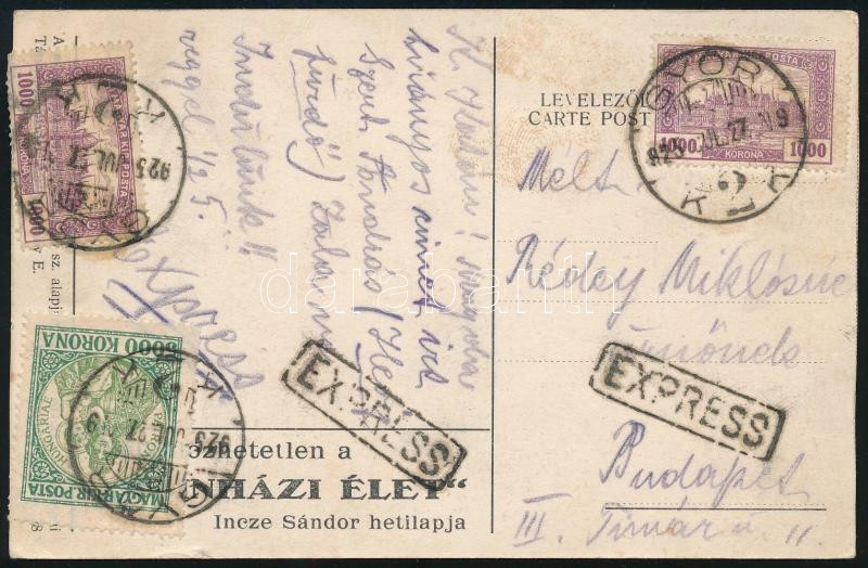 1925 Expressz képeslap 7.000K bérmentesítéssel Győrből Budapestre / Express postcard with 7.000K franking (Image)(Image 1)