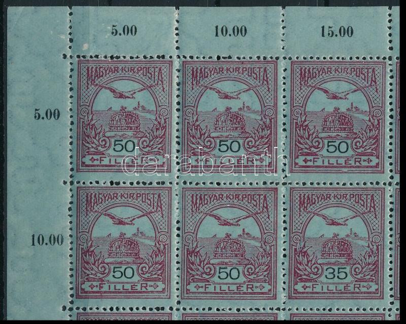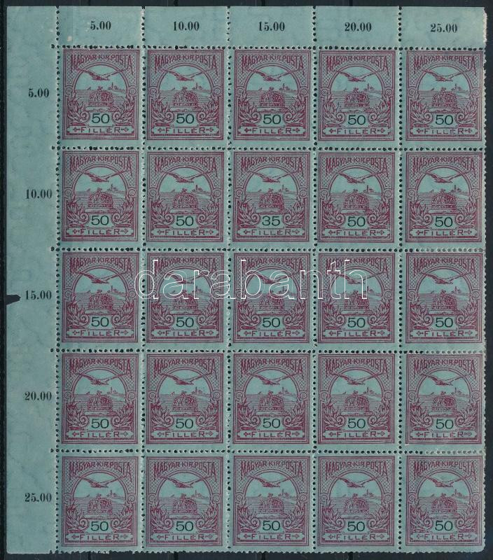 Turul 50f ívsarki 25-ös tömb, benne a 35f/50f tévnyomat (200.000) (falc az ívszélen, 1 bélyegen szakadás) / Mi 121 corner block of 25 with Mi 120F error "35" for "50" (hinge on the margin, 1 stamp torn) Hibás szedés miatt néhány száz nyomdai ív 13.