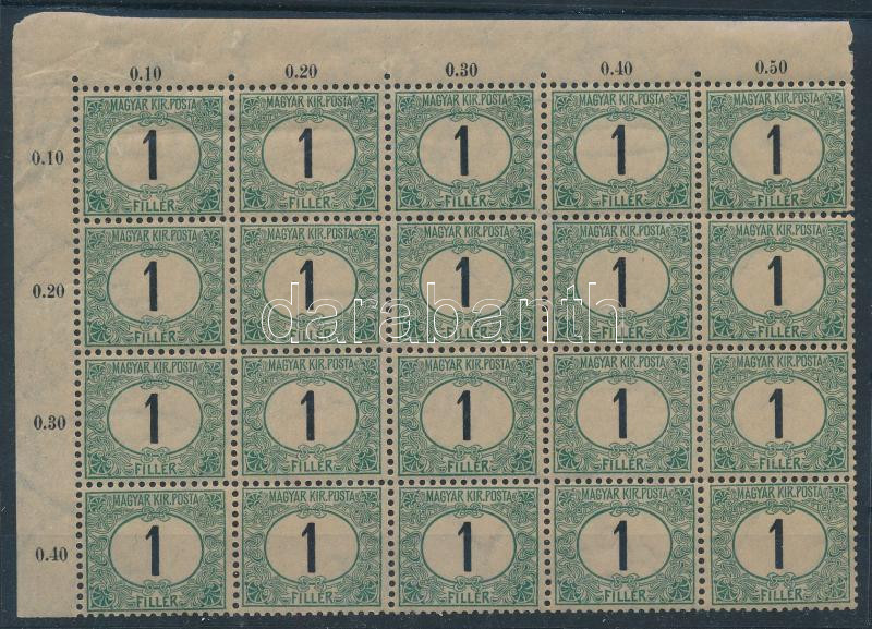 Zöldportó 1f ívsarki 20-as tömb 11 3/4 : 12 fogazással, ekkora tömb nagyon ritka! / Mi P 1 block of 20, perforation 11 3/4 : 12 (Image)(Image 1)