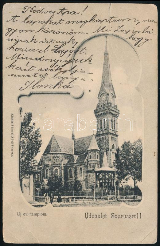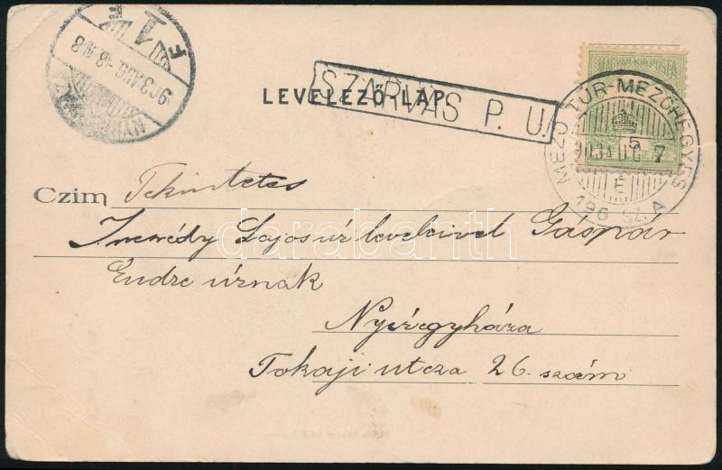1903 Képeslap "MEZŐTÚR-MEZŐHEGYES" vasúti mozgóposta bélyegzéssel + "SZARVAS P.U." / Postcard with railway postmarks (Image)(Image 1)