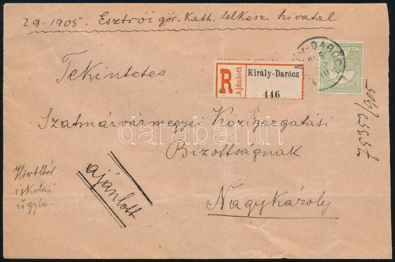 1905 Ajánlott levél 5 db Turul 5f bélyeggel / Registered cover 5 x 5f "KIRÁLY-DARÓCZ" (Image)(Image 1)