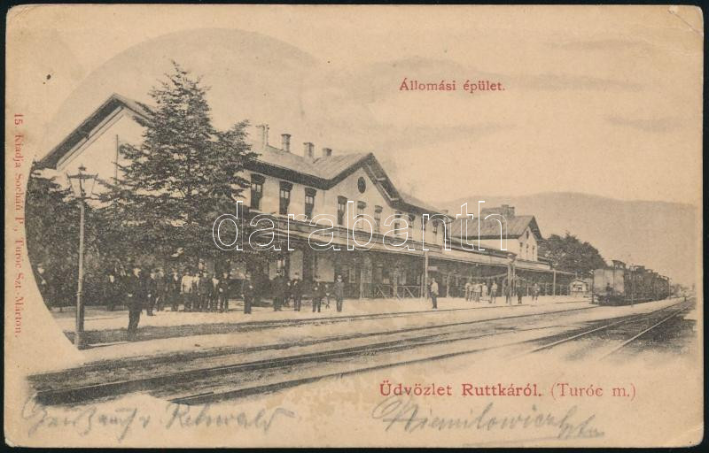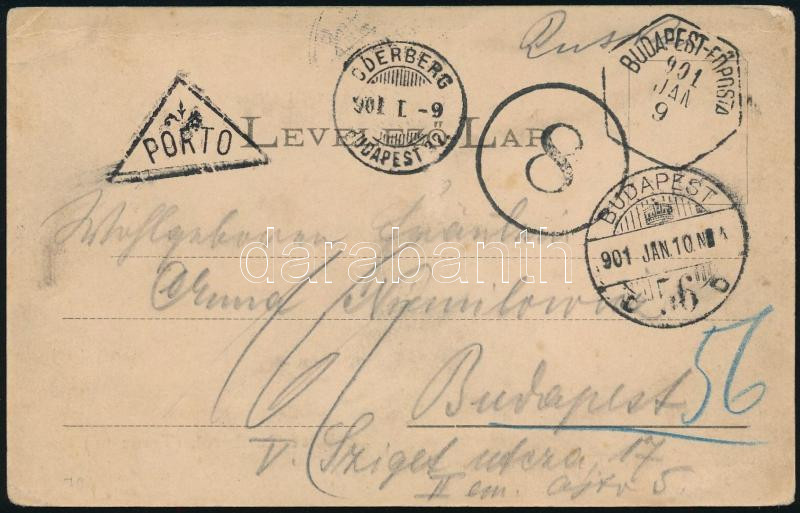 1901 Ruttka képeslap kézi ráírással, "ODERBERG / BUDAPEST" vasúti bélyegzéssel, 8f portóval és egyéb portó jelzésekkel / Postcard with railway postmark and 8f postage due (Image)(Image 1)