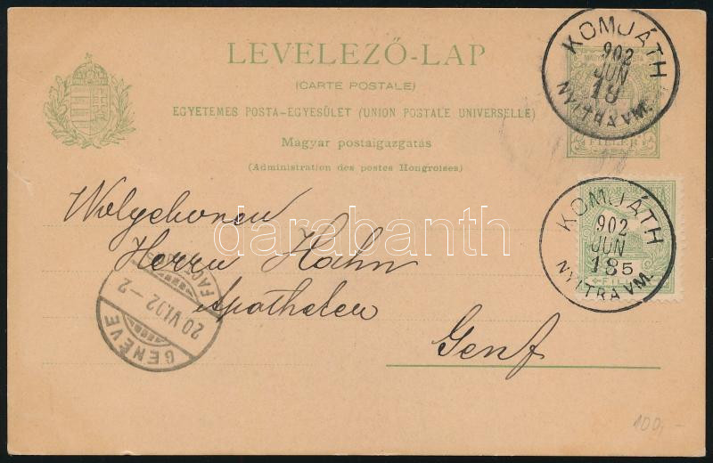 1902 Díjkiegészített díjjegyes levelezőlap Genfbe "KOMJÁTH / NYITRA VM." / PS-card with additional franking to Genf (Image)(Image 1)