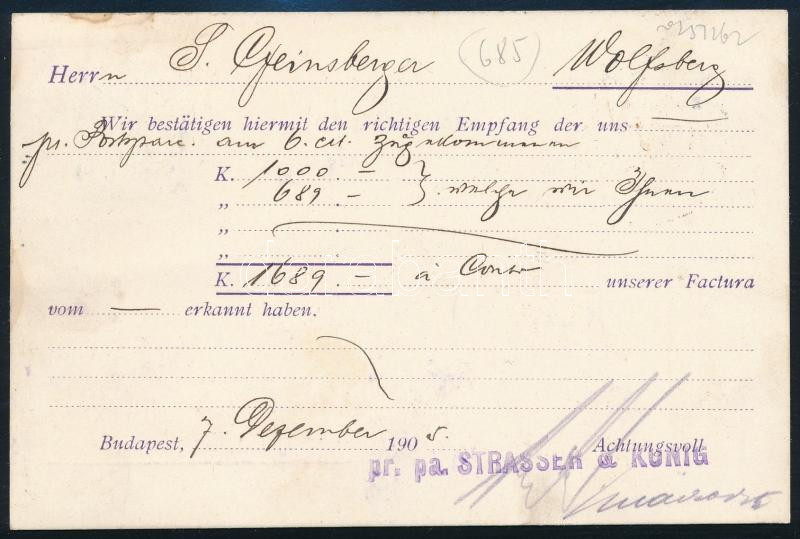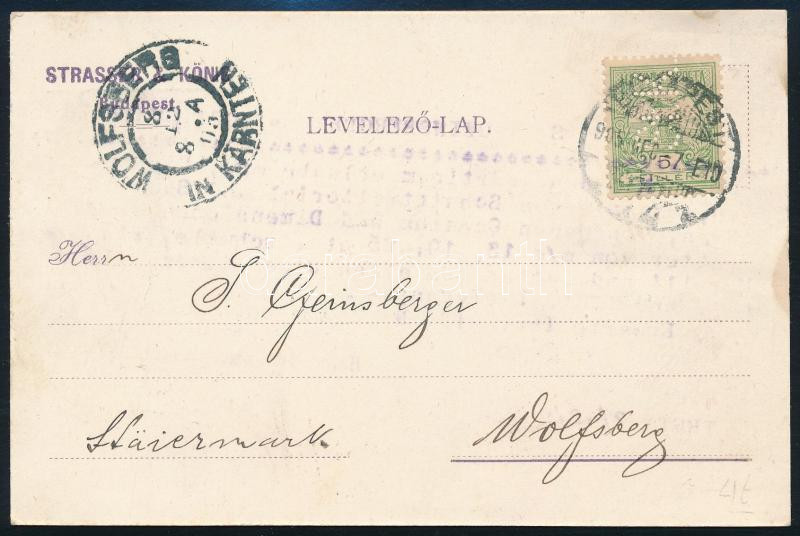 1905 Levelezőlap Turul 5f perfin bélyeggel / PS-card with 5f perfin stamp, "BUDAPEST" - "WOLFSBERG" (Image)(Image 1)