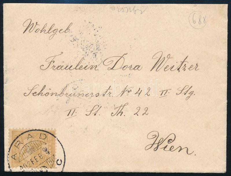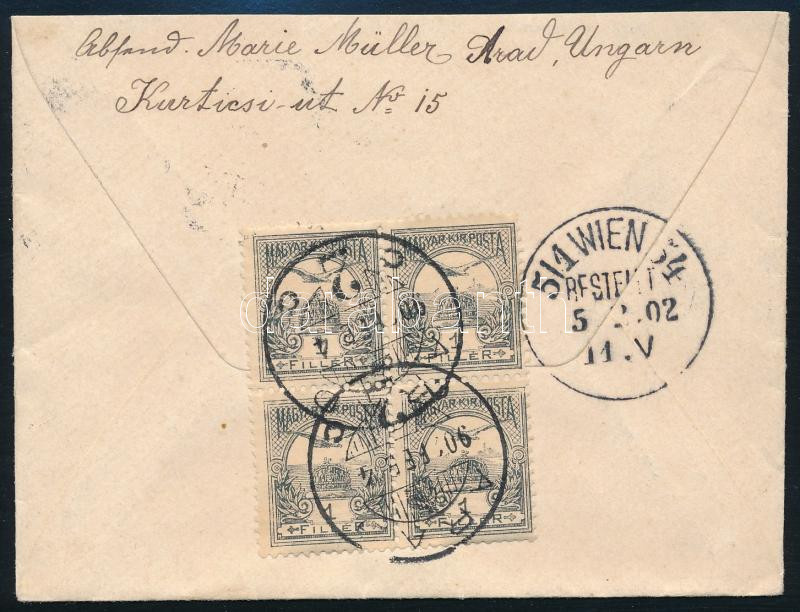 1902 Levél Turul 6f + hátoldali 1f négyestömb bérmentesítéssel / Cover with 6f + 1f block of four franking, "ARAD" - "WIEN" (Image)(Image 1)