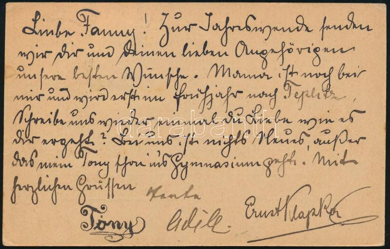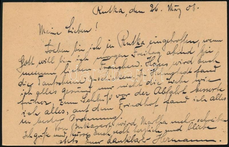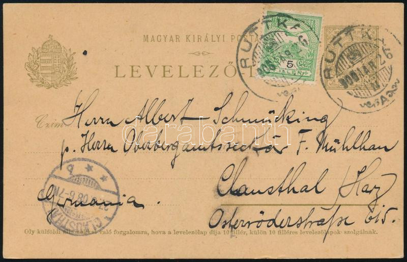1908 Díjkiegészített díjjegyes levelezőlap Németországba "RUTTKA" / PS-card with additional franking to Germany (Image)(Image 1)
