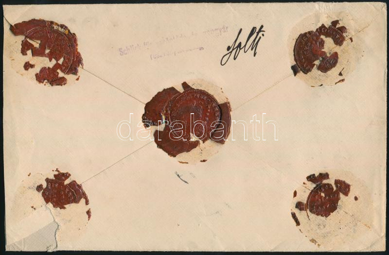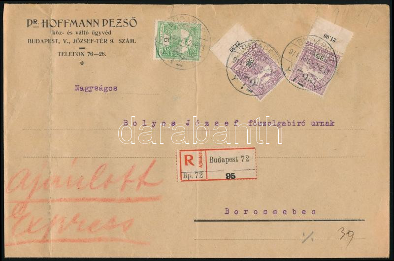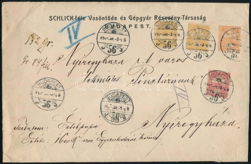 1910 Pénzes levél 4 db Turul bélyeggel "BUDAPEST" - Nyíregyháza / Insured cover with 84f franking (Image)(Image 1)