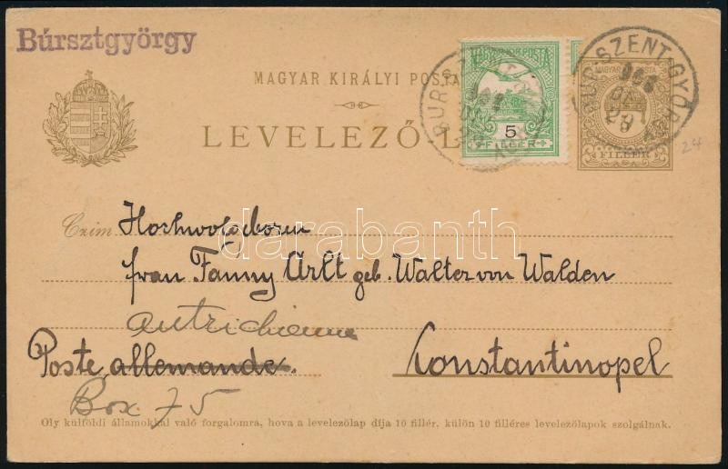1908 Díjkiegészített díjjegyes levelezőlap Konstantinápolyba "BUR-SZENT-GYÖRGY" / PS-card with additional franking to Constantinople (Image)(Image 1)
