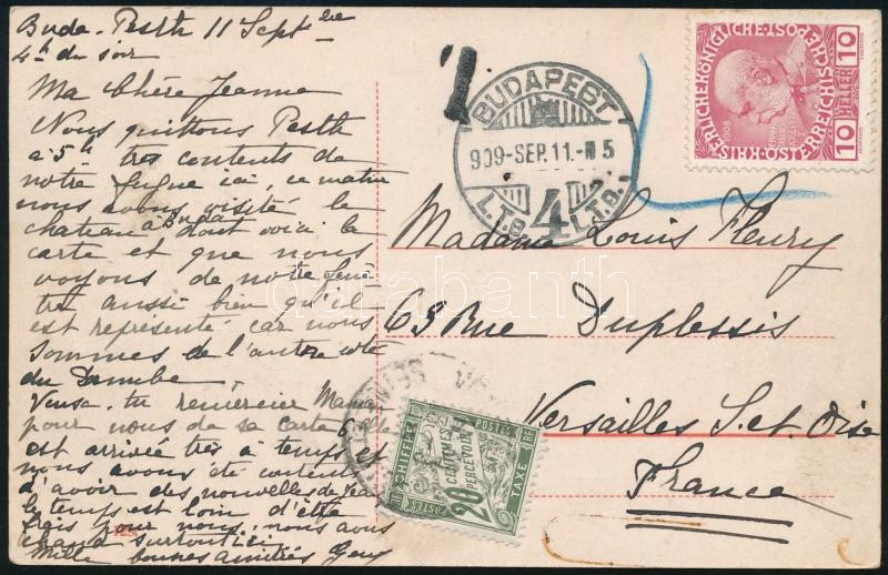 1909 Szabálytalanul osztrák bélyeggel feladott képeslap Franciaországba, megportózva / Postcard sent to France with an irregular Austrian stamp, with 20c postage due (Image)(Image 1)