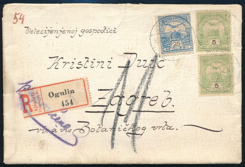 1907 Ajánlott levél 2 x 5f + 25f bérmentesítéssel, 11f kézírásos portóval / Registered cover with 11f handwritten postage due, "OGULIN" - "ZÁGRÁB-ZAGREB"