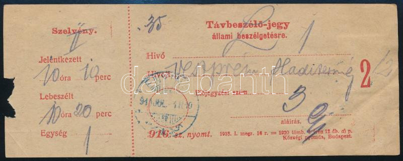 1910 Távbeszélő jegy 15f + 20f bélyeggel / Telephone ticket "ENYING" (Image)(Image 1)
