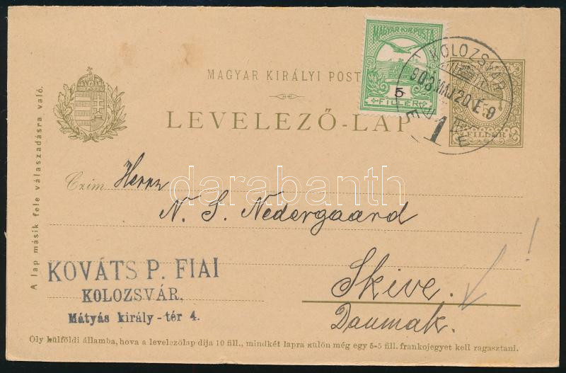 1908 Válaszos levelezőlap Dániába, majd visszaküldve / PS-reply card to Denmark "KOLOZSVÁR" - "SKIVE" (Image)(Image 1)