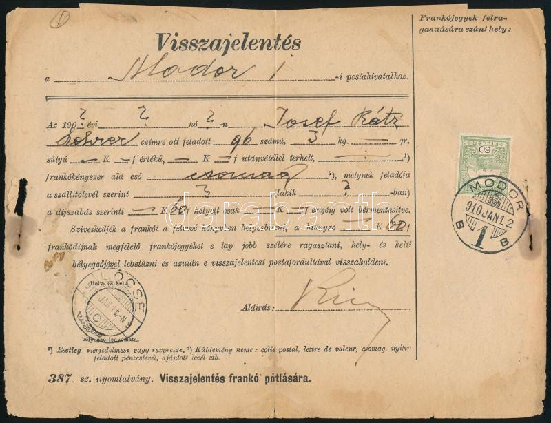 1910 Visszajelentés Turul 60f bélyeggel "MODOR" / Printed matter (Image)(Image 1)